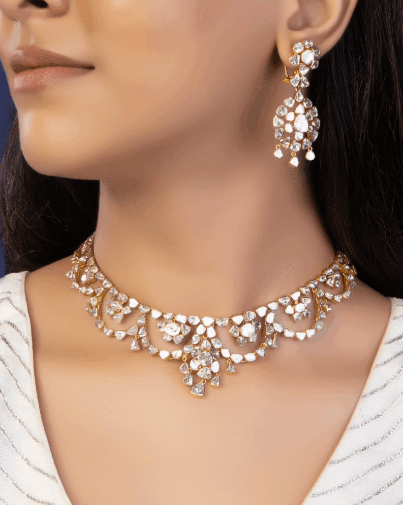 Zanaida Necklace And Rutvika Long Earrings Polki Set from Tyaani– A timeless blend of tradition and elegance, this exquisite set features the Zanaida Necklace paired with Rutvika Long Earrings. Meticulously crafted in 18kt gold, it showcases the brilliance of natural polki diamonds and vibrant gemstones. Certified for authenticity and backed by a lifetime guarantee, this heirloom-worthy set is a celebration of fine craftsmanship and enduring beauty.