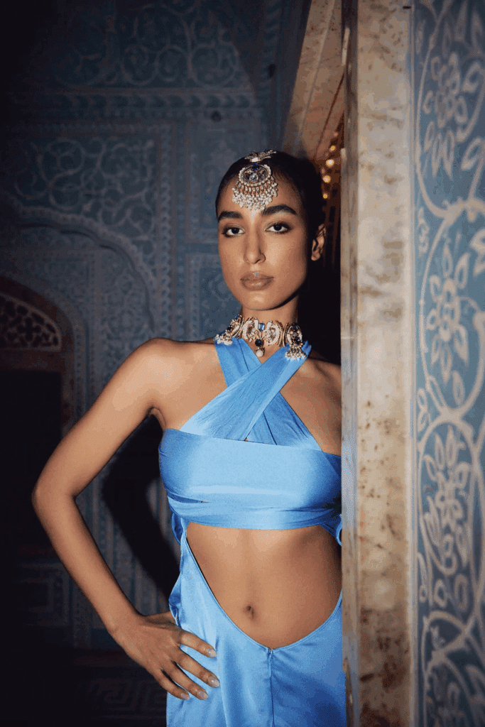 Le Palmetto Choker Necklace from Outhouse– To be passed down through generations as an ode to the joyful spirit of the bride, the Le Palmetto Choker is a precious treasure to behold. Carved with cubic zircon, carved stone, cushion cut crystals and natural pearls, this piece is intricately finished in 22kt gold plating. With sparkling details and an eye-catching aesthetic, the choker lights up the most indelible day in a brides life.