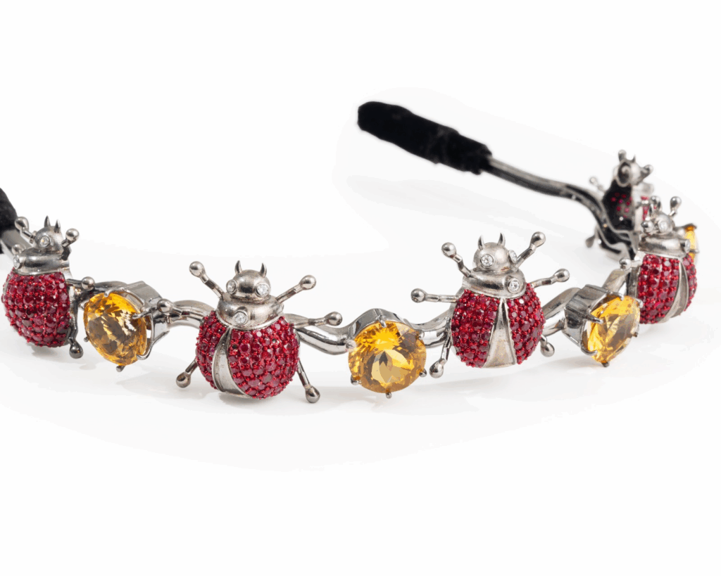 Equal parts whimsy and wonder, this sculptural headband makes a playful case for statement accessorizing. Ruby-studded ladybirds march across a gleaming vine of golden citrine, bringing a storybook-like charm to bridal parties and wedding guests alike. It’s the kind of piece that draws attention from across the room long after the celebration ends.