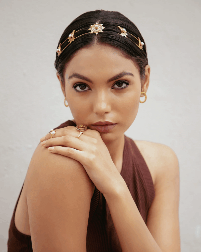 Crafted in India with meticulous detail, the head gear is made of 18k gold-plated brass and adorned with freshwater pearls, offering an elegant balance of luxury and subtlety. The delicate dimensions—approximately 2.7 cm in length and 50 cm in width—ensure a graceful, wearable fit.