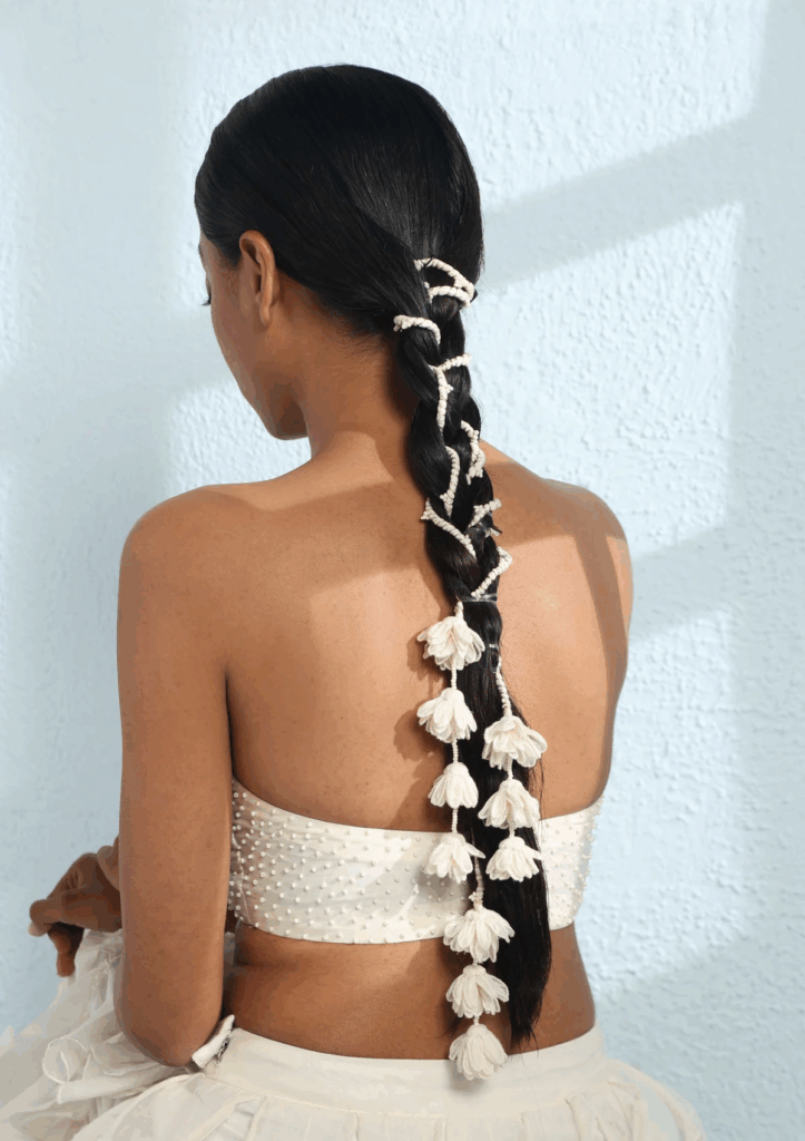 An exquisite mix of elegance and craftsmanship, the Moon Floral Parandi is the perfect hair accessory to weave into braids or wear as a wreath for shorter styles. Lightweight and beautifully versatile, its delicate white blossoms are designed to complement and elevate any look. 100% Handmade by women artisans from Harijan Basti, celebrating heritage craftsmanship!