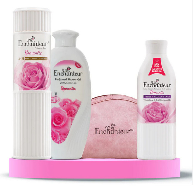 A charming gift bag featuring shower gel, lotion and talc in Enchanteur’s signature rose-jasmine-vanilla fragrance — delicate, elegant and utterly pampering.