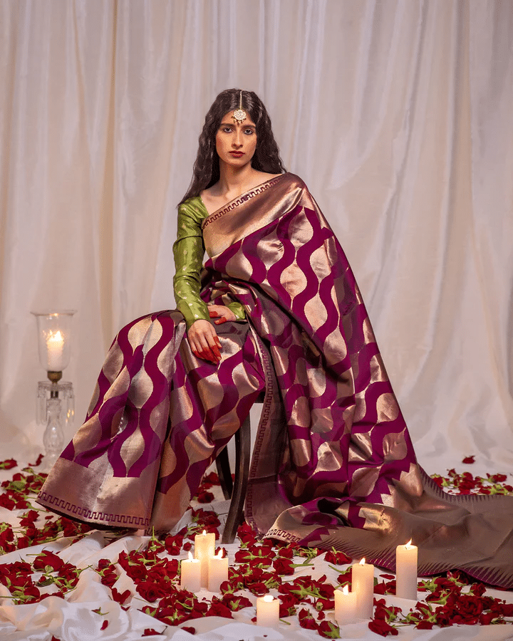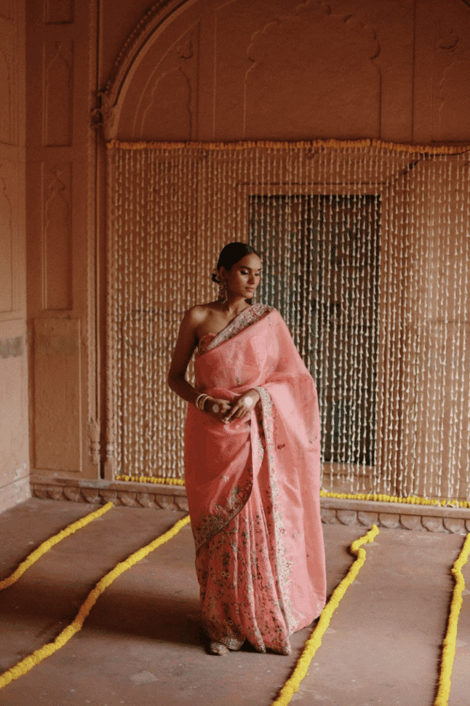 Pastels like blush, lavender, mint, and powder blue are stealing the spotlight for day celebrations, while metallics and champagne tones shimmer under moonlight soirées. These hues whisper grace rather than shout tradition — a soft rebellion wrapped in silk.