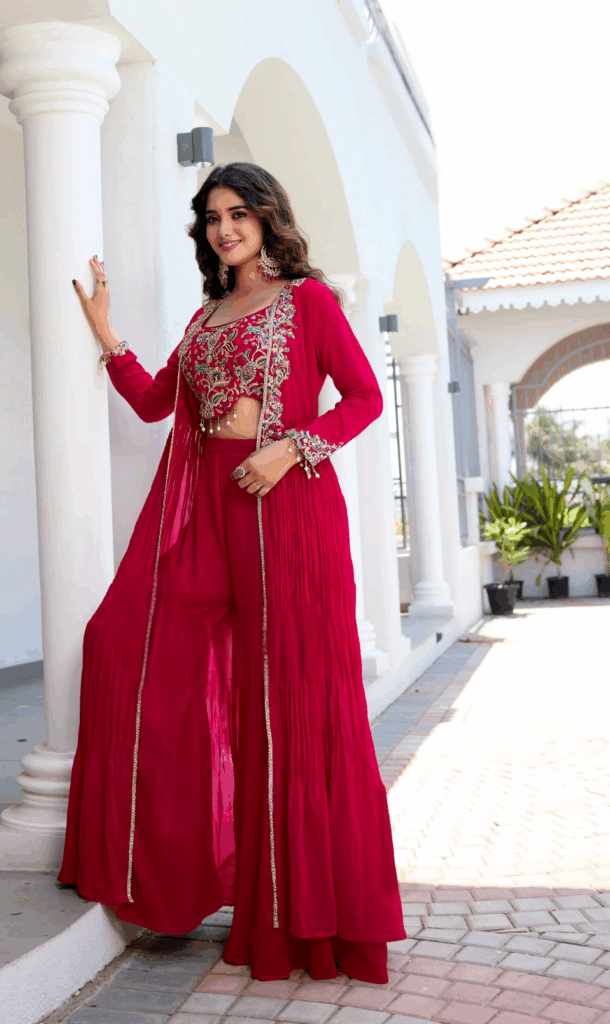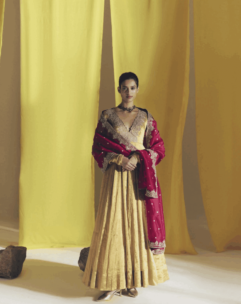 Think beyond the classic Banarasi. Our lightweight organza sarees, adorned with delicate hand embroidery, are made for the newlywed bride who wants to look graceful without the weight of convention. For those seeking drama, our Bandhani and Kalamkari appliqué Anarkalis bring India’s textile artistry to life in youthful, striking silhouettes. Meanwhile, timeless kurta–sharara sets in radiant shades of red and pink strike that perfect balance festive yet effortless, traditional yet modern.
