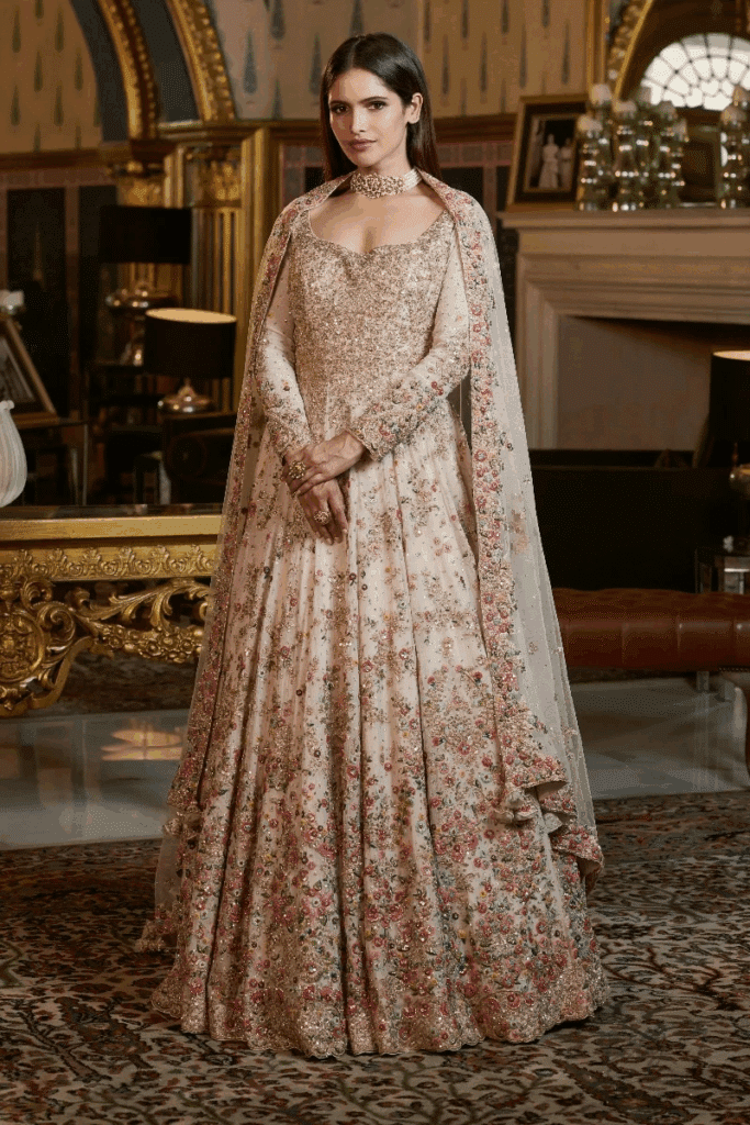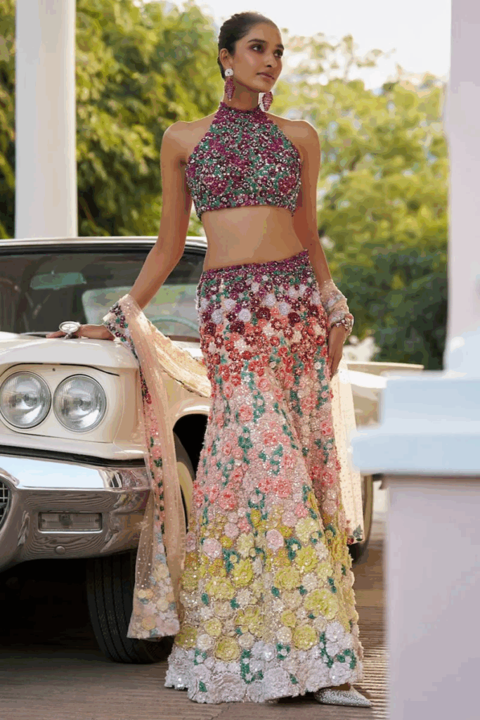 With layers that move like a dream and crop tops that add just the right amount of sass, shararas have evolved into bold bridal picks. One standout this season? The Ombre Multi-Coloured Three-Dimensional Floral Sharara Set. It features exquisite embroidery that fades beautifully from ivory to yellow, peaches, pinks, and plums. Adorned with 3D florals, crystals, bugle beads, and platinum cut sequins, the halter blouse is fully embroidered and brings a contemporary edge to a classic cut. It’s finished with an embroidered dupatta, floral motifs, and a border to tie it all together.