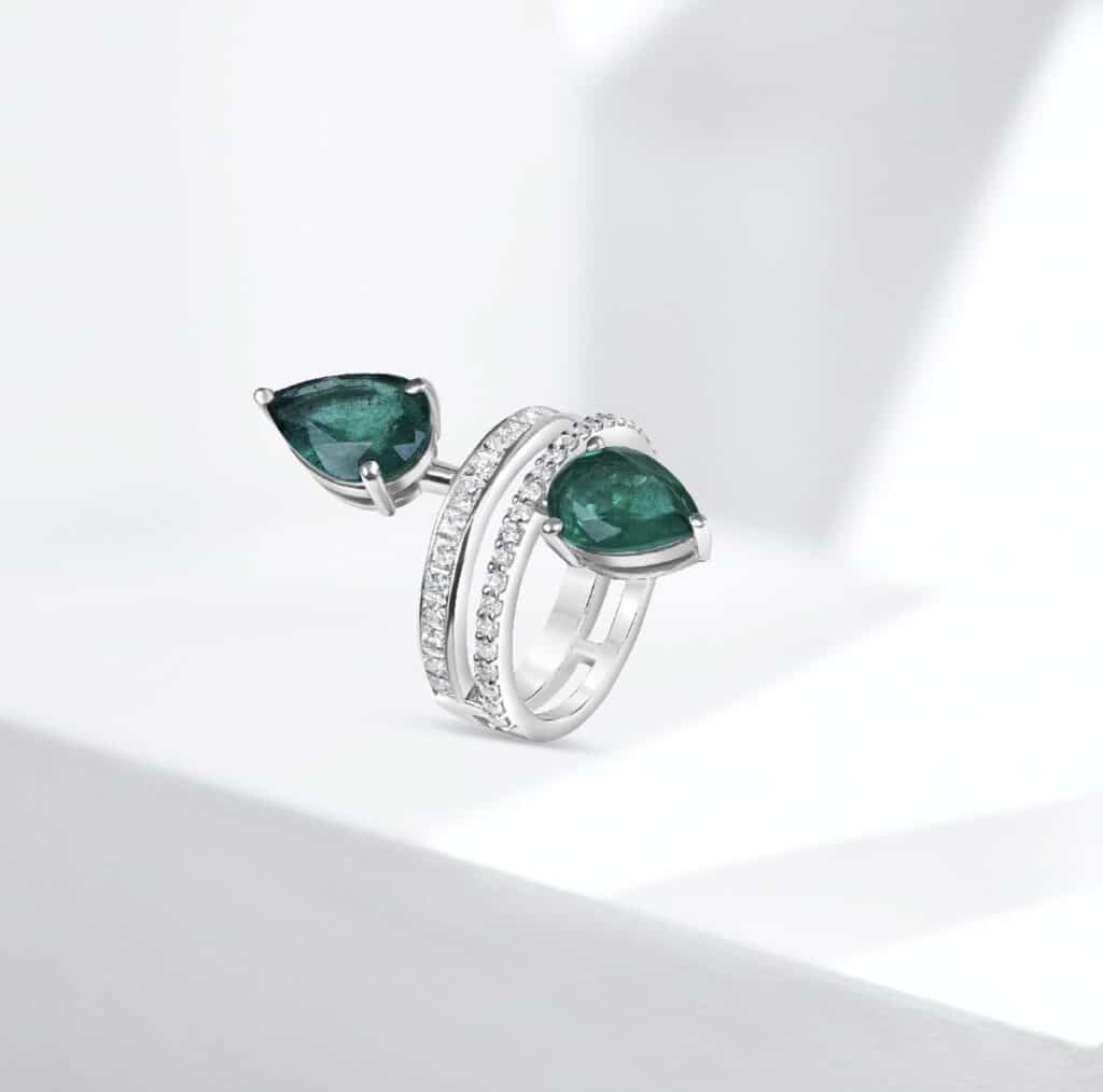 A contemporary emerald diamond ring from Jaipur Jewels is proof that sometimes, less truly is more. With two pear-cut emeralds gracefully facing away from each other, held together by dual eternity bands in the centre, this ring embodies timeless style and sophistication