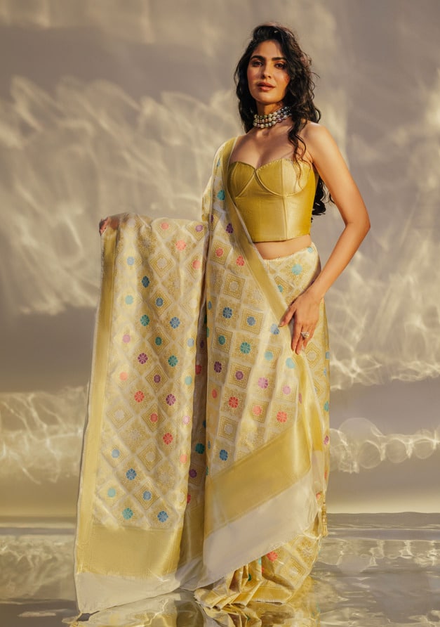 Warp ‘N Weft, a bespoke couture house of contemporary Banarasi heirlooms is a classic marriage of India’s textile heritage with unabashed glamour. The Perla Banarasi Saree Ferozi adopts a feminine chevron in Tanchoi, reflecting the iridescence of a three-dimensional colour from the seas.