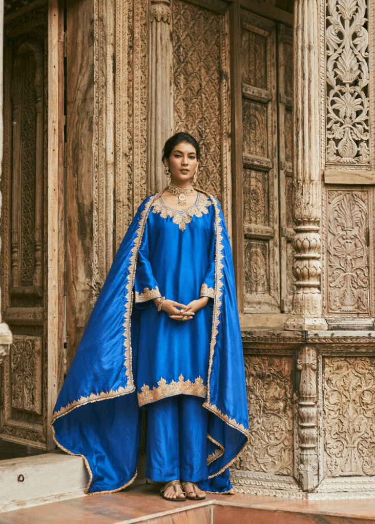 into the modern era through carefully considered, minimalist designs. The ‘Mansa’ Blue kurta set crafted from Dupion Silk features intricate traditional gold border and neckline. It is paired with a matching hand Embroidered Blue silk Dupatta.