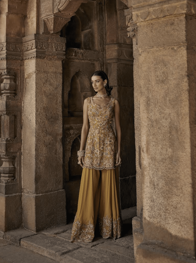 Introducing the Frontier Raas silk organza sharara set in hues of dandelion. This ready-made ensemble comes with a straight short shirt and chic sharara. The shirt is adorned with handcrafted embroidery of thread, dori, glass beads, pearls, and micro sequins that catch the light beautifully. The plain sharara features a heavy scallop border with similar floral embroidery. Perfect for festive occasions like haldi, sangeet and special events, this outfit radiates timeless allure.
