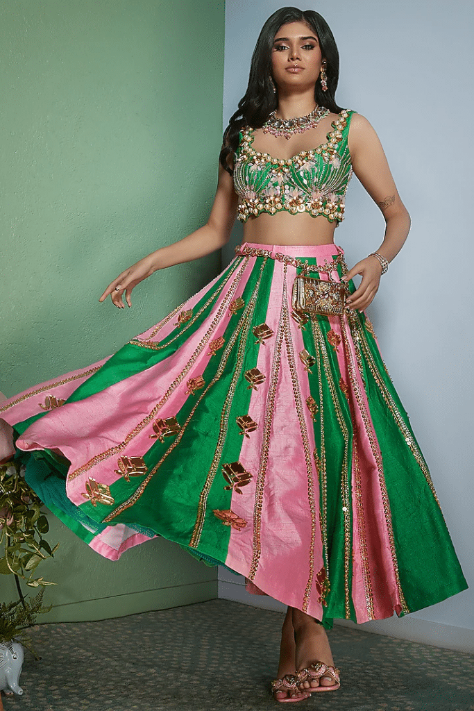 Featuring a fuchsia pink and leaf green paneled lehenga in raw silk base with 3D patchwork, glass beads, pearls, stones, metallic motifs and acrylics embroidery. It is paired with a matching blouse having aari embroidery.