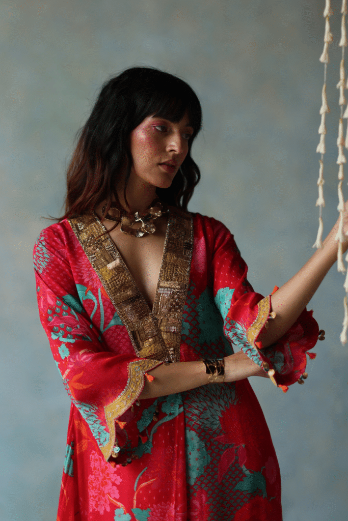 Jester red printed crepe kurta with intricate hand embroidered neckline and scalloped dori work on sleeves with tassel detailing , paired with hot pink modal palazzo with applique dori embroidery.