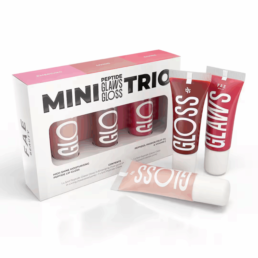 Get glam and glossy lips with the FAE Beauty Mini Peptide Lip Gloss Trio | With Passionfruit Oil & Argireline to Smoothen, Even, and Soften Lips | Non Sticky | Hydrating | Vegan | Shades – Emerging | Living | Giving. It includes three pretty hues—a rose gold shimmer, a rosewood pink, and a warm Barbie pink—to compliment both full-makeup and no-makeup looks. Formulated with Argireline and passionfruit, these cushiony glosses help keep your lips wrinkle-free, soft, and moisturized. With the shiny look of a gloss, the non-sticky feel of a lip oil, and the nourishing benefits of a peptide treatment, this gloss trio is the perfect treat for your pout.