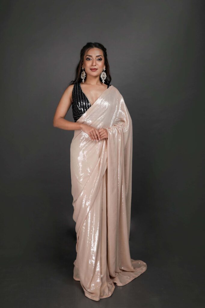 Dazzling sequined sarees add a luxurious touch to your overall look. These sarees give you a sparkling look and make you look alive. You can wear light sequence saree for festivals, ceremonies and other casual occasions and also it is the best wear for newlyweds as per their comforts. On the other hand, women love to wear heavy sequins or full sequined saree for special occasions and parties. A little sequin work will keep your saree alive in fashion runs for years to come. In both winter and summer seasons, you can wear sequin sarees. This sequin saree with diamond jewelry or accessory will make you look like a Modern Diva. A Wavy loose hairstyle with glitter hair pins will look absolutely gorgeous. Sequined saree with a well-designed blouse and then this simple hairstyle is perfect. This will complete your overall look.
