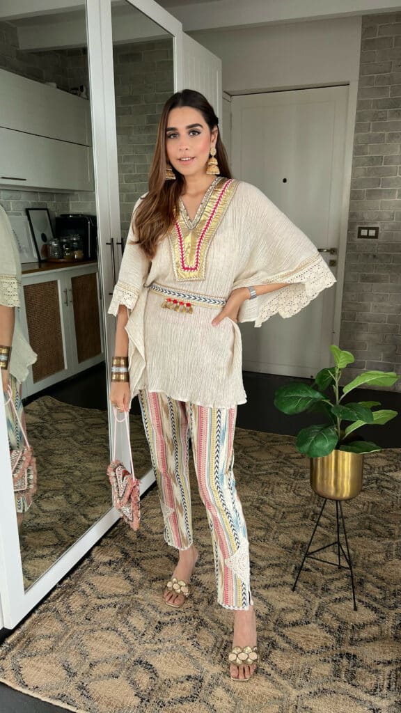 What does every bride need after the grandiose and glamour of her wedding looks? To still look as glam with minimal effort and maximum comfort! This particular look from the brand NIKU is a must have in every bride’s trousseau to take her from day to night with ease. A stylish Kaftan Top and Cigarette Pants with a gold gota yoke and belt add a traditional twist to a modern silhouette. Crochet detailing on the sleeves and pants give this outfit a flirty, feminine feel while the tasseled be. lt adds just the right amount of boho. Every outfit from NIKU promises to be trendy, chic yet comfortable, just what the modern woman is!