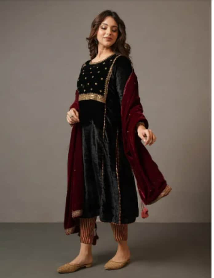 The lustrous luxury of winter-special kurtas that carry the beautiful drape and sheen of the lush tufted fabric of velvet in regal shades of maroon, navy and black. Jewel-like opulence of hand-embroidered marodi and zari details enrich each piece with Mughal motifs.