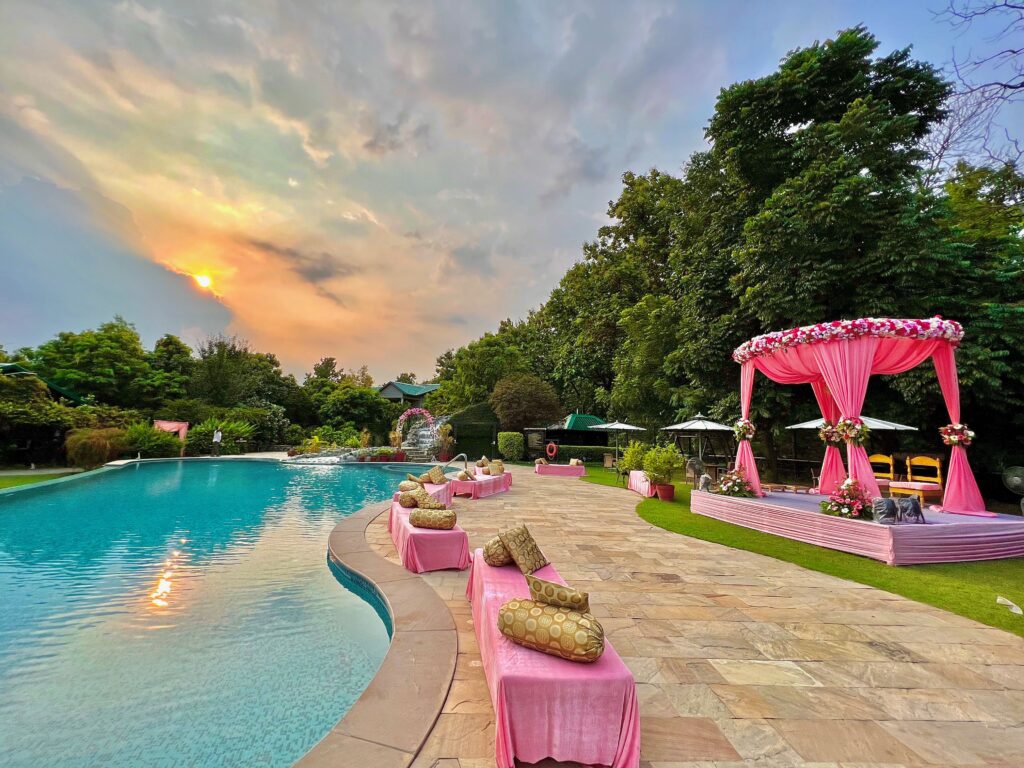 There is something exceptionally magical and romantic about the wilderness. Nestled between the glorious woodland of Corbett National Park, Aahana-The Corbett Wilderness brings to you the enchantment of a luxurious woodsy wedding that takes place underneath the stars. Spread over 13.5 acres of sprawling greens with 48 rooms the resort is perfect for an intimate luxury wedding. To make it a unique and memorable affair, Aahana offers you multiple services and takes the burden off your shoulders, so all you may care about is the fun and frolic of a grand wedding. The lavish decoration and lighting are taken great care of to mark an unforgettable event. The culturally inspired venues can be tailored to suit your style with the bride and the groom perching on the wedding mandap fashioned in a uniquely traditional manner.