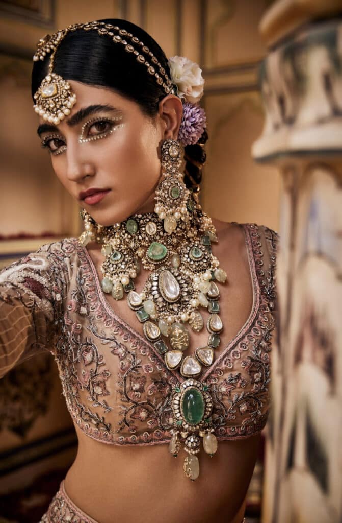4. Accessorize with Elegance: Don’t forget to accessorize. A statement necklace, chandelier earrings, or a traditional Kundan set can elevate your outfit and add a touch of luxury.