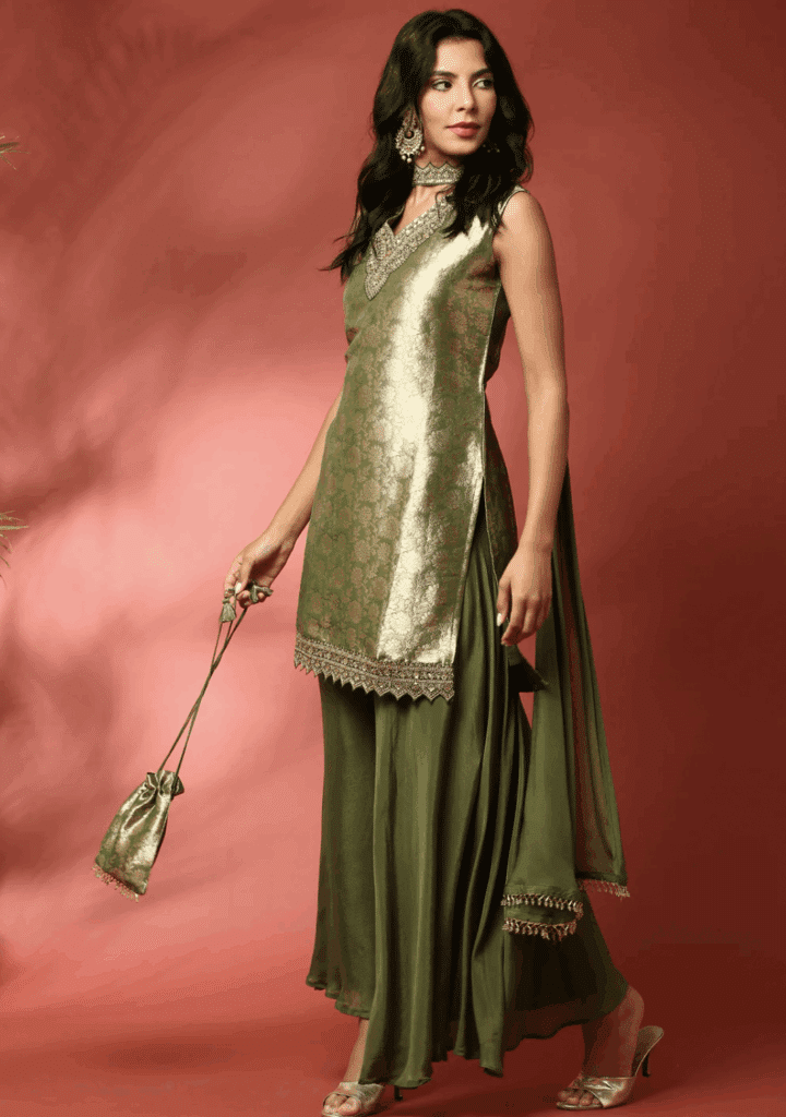 Green Banarasi Silk Embroidered Short Kurta and Palazoo Set from Neeru’s