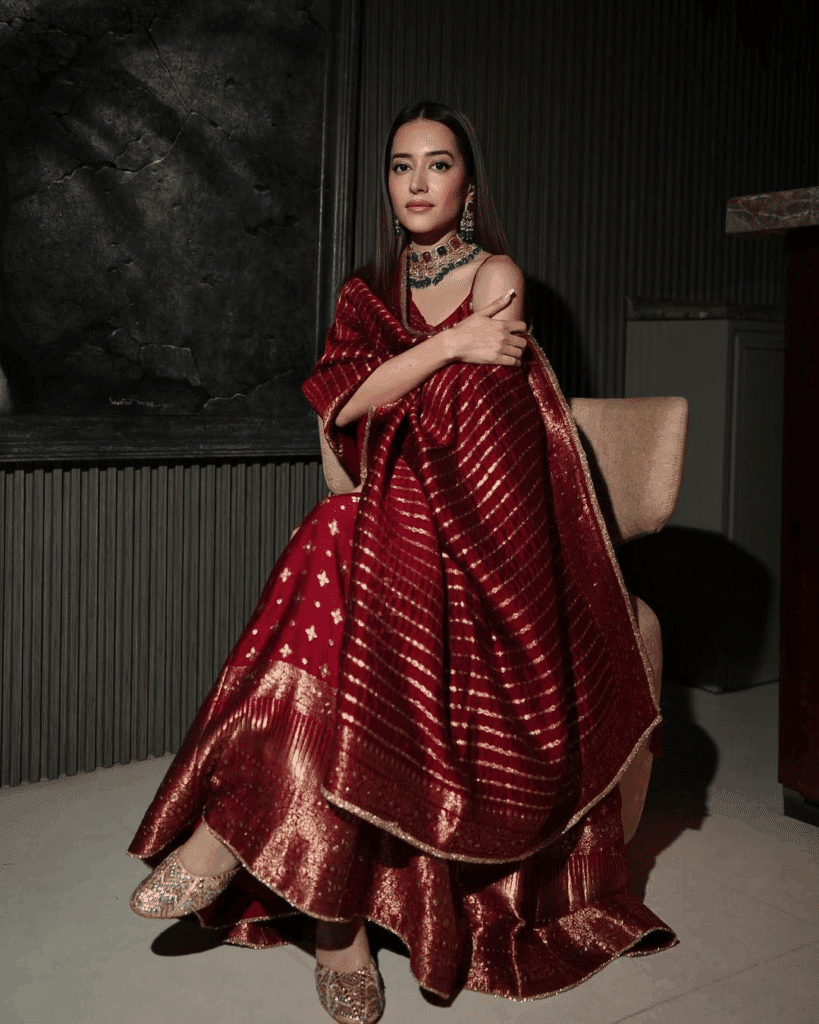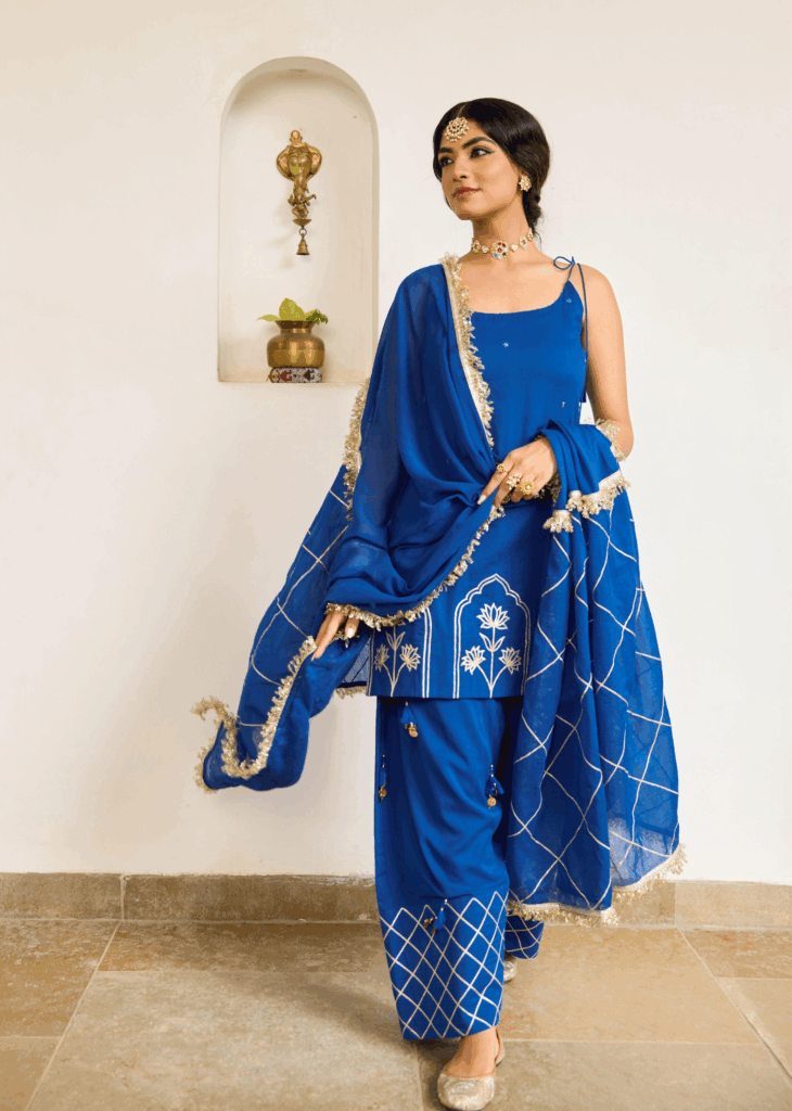 The fabric is soft mulmul, dyed in deep neer royal blue colour. It’s detailed with gotta jharokha that shines like Jaipur’s sun-kissed walls, while the farshi shalwar flows freely with bead and crystal hangings, inspired by the city’s lively bazaars.