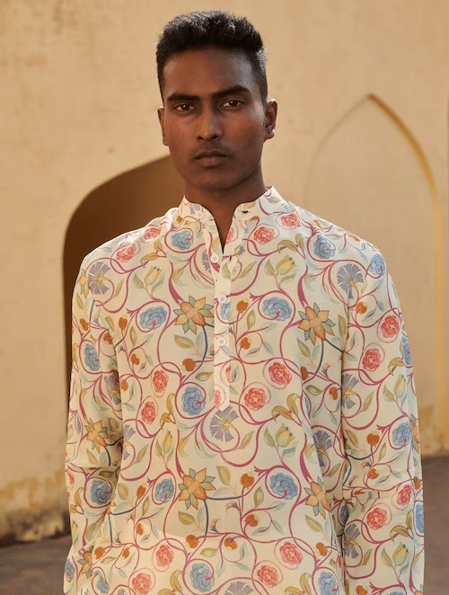 Cream Silk Printed Mandarin Collar Slim Fit Kurta