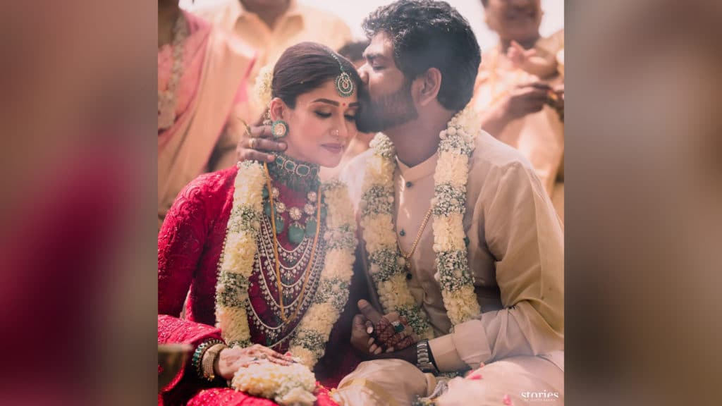 Actress Nayanthara and director Vignesh Shivan tied the knot around 10 am at a private ceremony in Mahabalipuram in the presence of their close friends and family. The bride is seen in a pretty red saree with Jade jewellery complimenting it. The groom is seen in a cream sherwani and has a simple gold chain as an ornament.