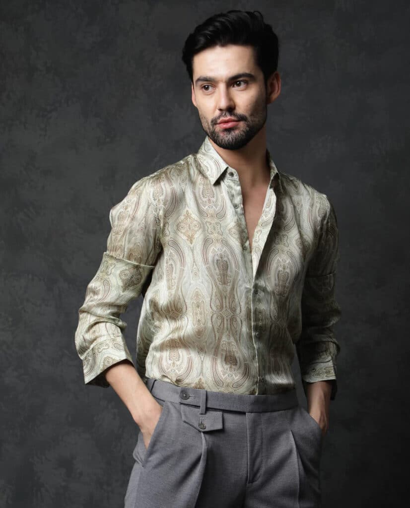Introducing the epitome of luxury and style – the Premium Bemberg Satin Paisley Print Shirt from Rare Rabbit. Elevate your wardrobe with this sophisticated full-sleeve shirt crafted from exquisite Bemberg satin, featuring a captivating paisley print that adds a touch of opulence to your ensemble.