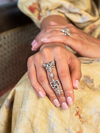 Elizabeth Bennet Ring in 925 Oxidised Silver from Shaya by Caratlane. This Silver Knuckle Free Size Ring is studded with Rosecut Glass Polkis. Crafted in 925 Silver with an Oxidised Finish, this piece is uniquely handcrafted and no two pieces are exactly alike!