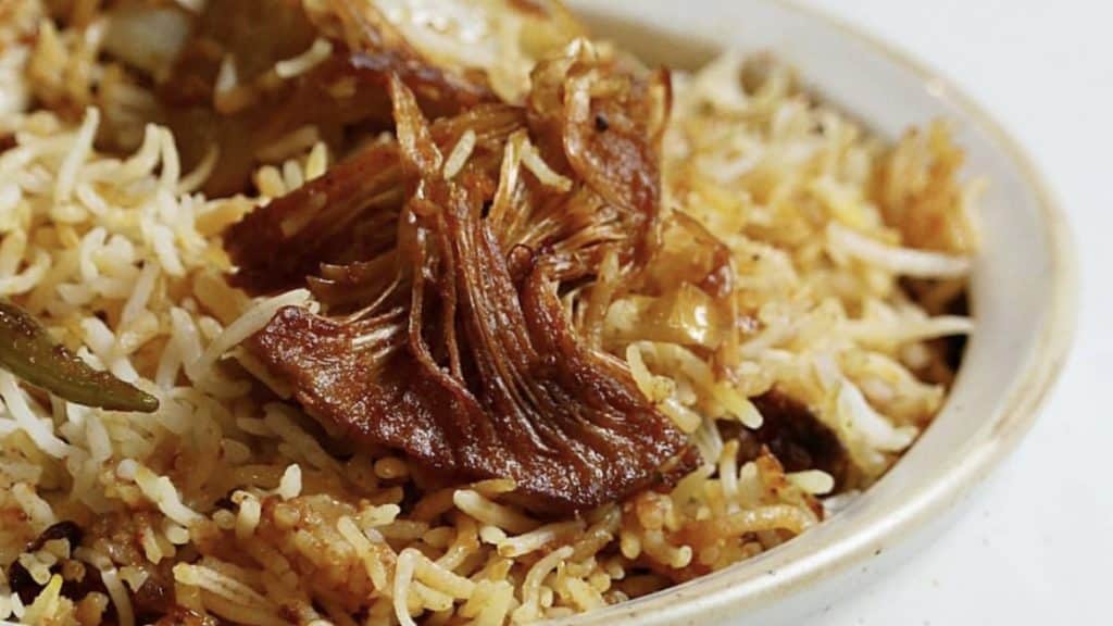 The menu seems to consist of pure vegetarian dishes with their roots in Kerala. The one dish that catches our attention is Kathal Biriyani (Jackfruit Biriyani). Kathal biriyani is a dum biriyani made with raw unripe Jackfruit. This dish is quite popular among vegetarian and vegan wedding dishes as the raw jackfruit when cooked has a soft meaty texture. Unripe jackfruit is also called vegetarian meat!