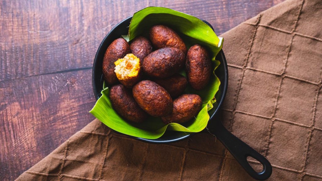 Kai Porichathu, also known as Unnakai, is a popular dessert from the Malabar region. It is made from plantain and is often served as a sweet at weddings and other festivals. The mashed plantain puree is used as a dough and made into patties that are stuffed with sweetened beaten egg, coconut, nuts, raisins, and cardamom. This patty is then deep-fried in oil and is also served with sago-based white sauce.