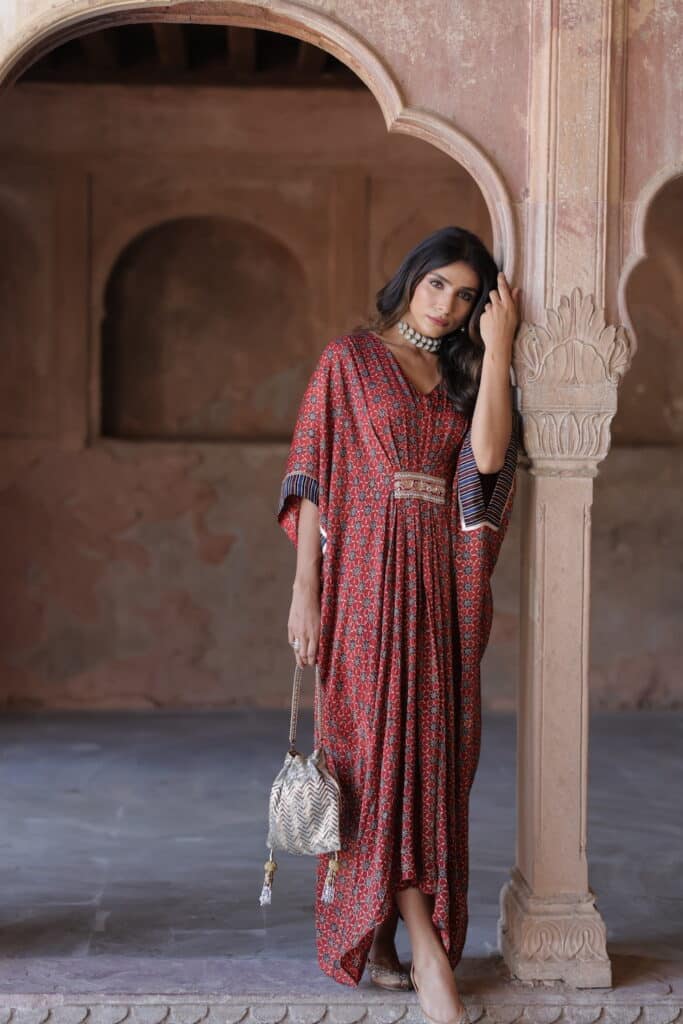 This festive season Din Raat has outplayed beautiful kaftans in rich colors for the festive collection, Riwayat. Finely pleated kaftans made in Ajrakh print that is delicately hand block printed. Detailed with hand done zari work and long loose sleeves making it your go to comfortable outfit for all the upcoming festivities. Feels soft on the skin. Every Piece at Din Raat is curated with love keeping fashion sustainable and affordable. As a conscious luxury label, Din Raat clothing uses organically dyed fabrics, packaging them with plantable (seed) Paper.