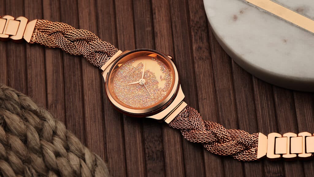This marvel from the exquisite Raga Delight collection, offers a concoction of fashion, glamour and elegance that adds splendour to any occasion. This inimitable piece has a two-layered dial, where premium stones float in between the two layers, creating a playful effect. The rose gold hued watch comes with a distinct case and is enriched by a strikingly braided mesh bracelet.
