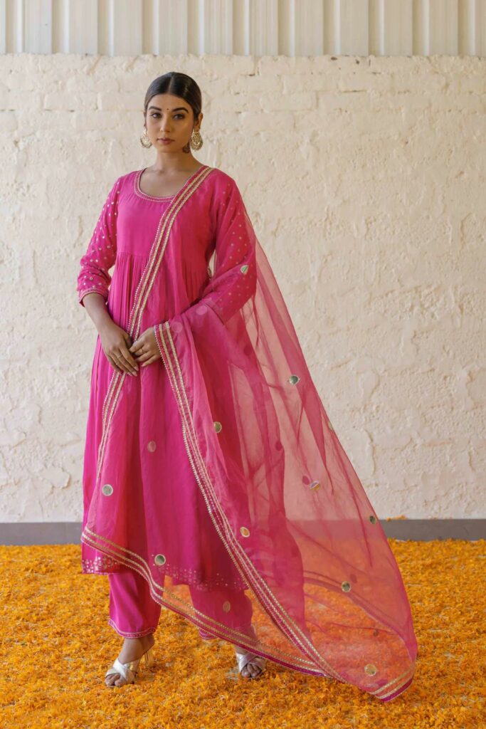 This shocking pink embroidered suit set needs a special mention for the upcoming International Women’s Day. Gift this to your wife, mother, sister or a friend and make them feel extra special on this special occasion. The whole outfit is made by Art Silk. It has zari and disc mirror work all over the dupatta. The bright magenta pink will enhance your look so well on every special occasion.
