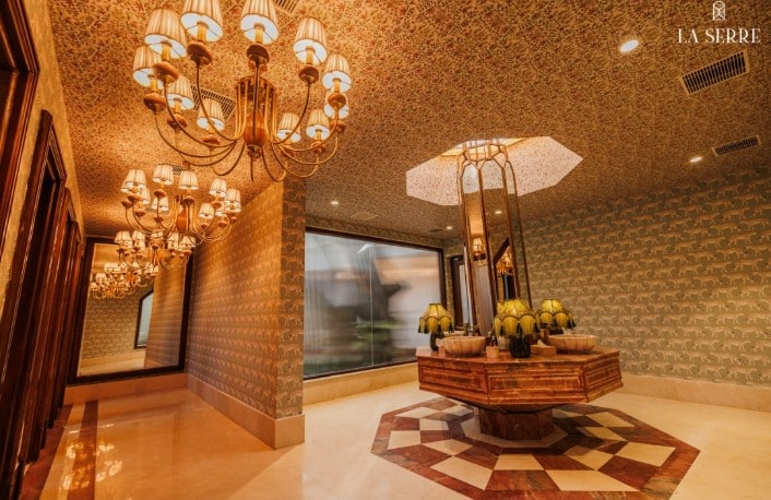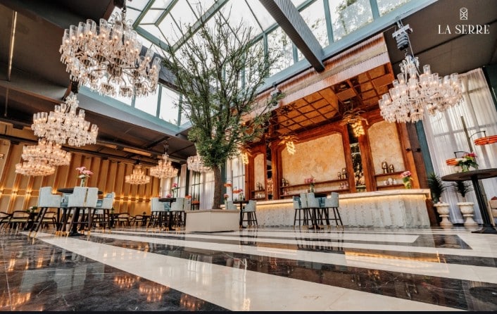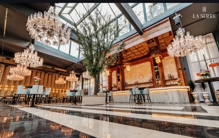 Glass structures, like La Serre, exude sophistication and timeless beauty. The venue’s blend of limestone, white onyx, and intricate details creates a stunning backdrop for weddings, where modern aesthetics meet classic elegance. Particularly during winter, the venue transforms into a magical setting, offering couples and their guests an unforgettable experience.