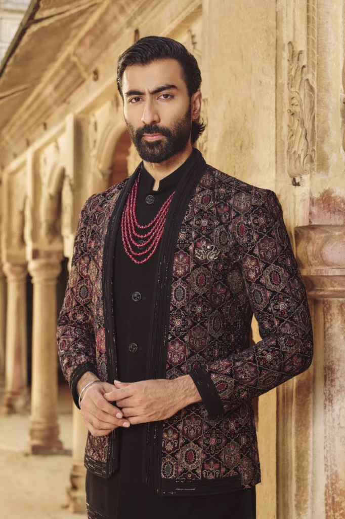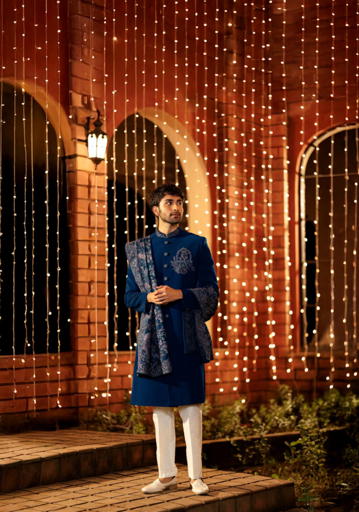 Indo-western silhouettes appear in midnight blue, charcoal and jewel tones. The cuts are sharp, the shoulders structured and the fabrics carry a subtle sheen. These pieces are made to look striking under lights and still feel light enough for the dance-heavy nature of the event. This part of the collection helps the groom maintain a balance between celebration and modern polish.