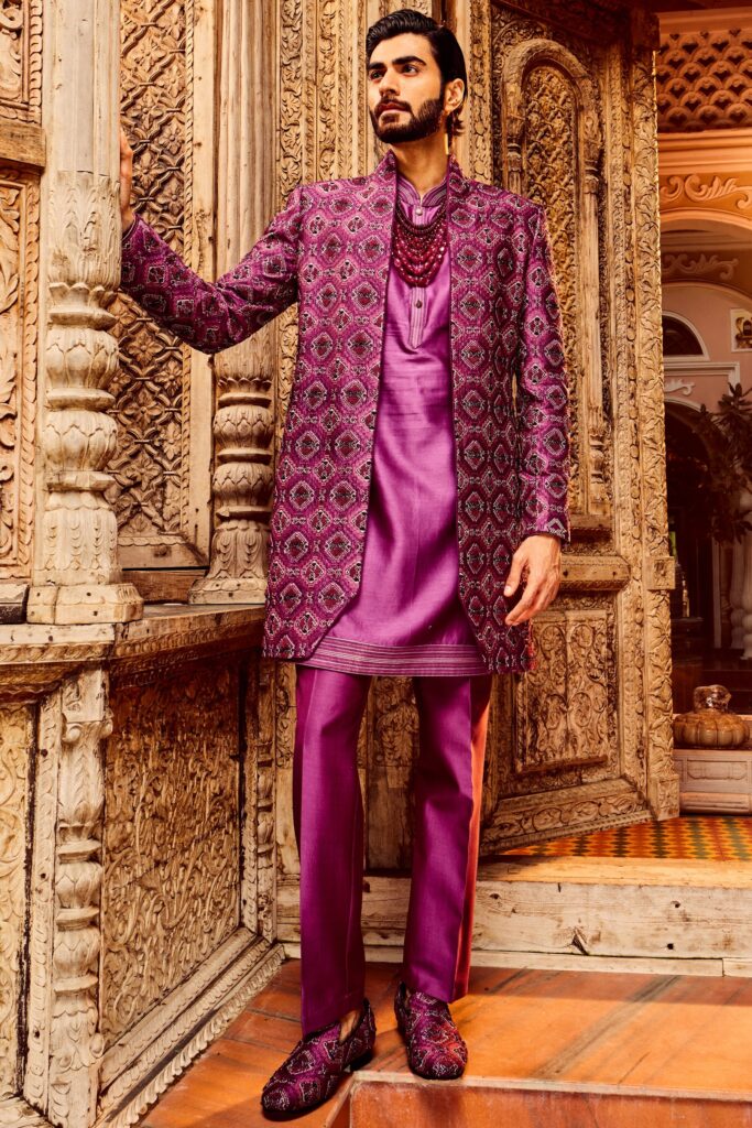 For Him- A regal Purple Chanderi Silk Embroidered Open Indo-Western ensemble that seamlessly blends tradition with modern elegance. Crafted from luxurious Chanderi silk, this statement piece features intricate embroidery, an open-front silhouette, and a fluid drape, perfect for effortless sophistication. Ideal for festive occasions and contemporary celebrations.