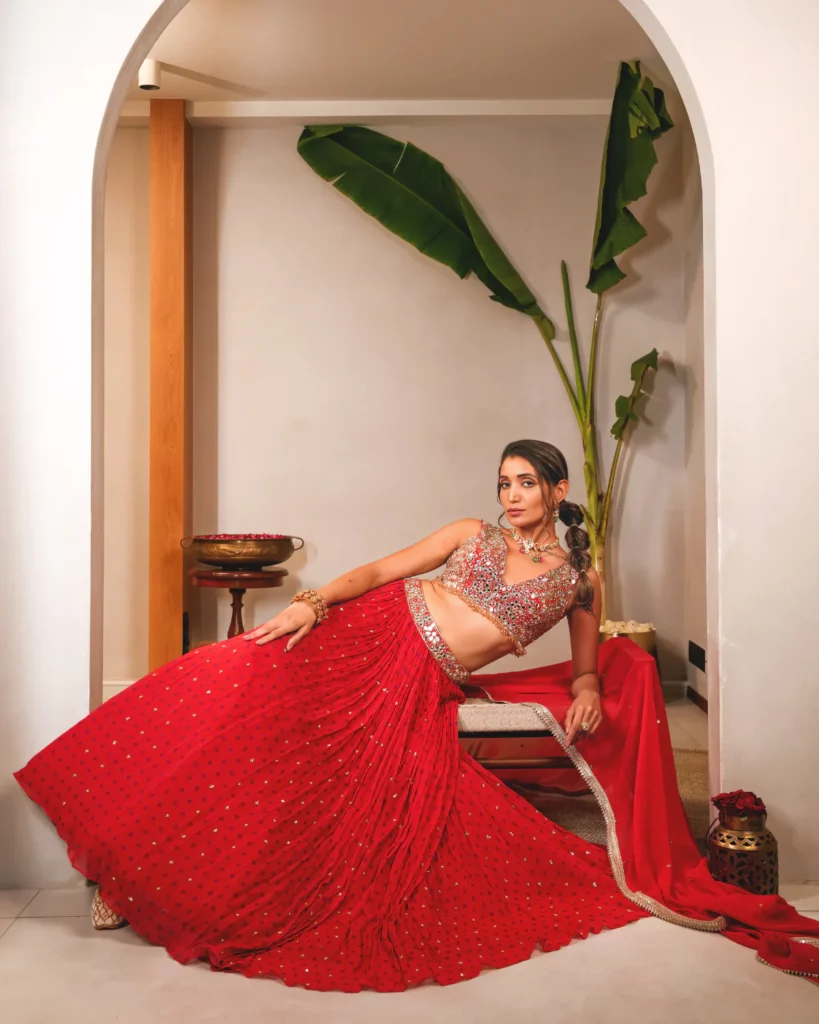 For Her- The Nazakat Set channels modern femininity with bold hues and intricate buti work. Paired with a matching blouse and dupatta, this lehenga transitions seamlessly from daytime festivities to evening elegance – flowing effortlessly with your every move.