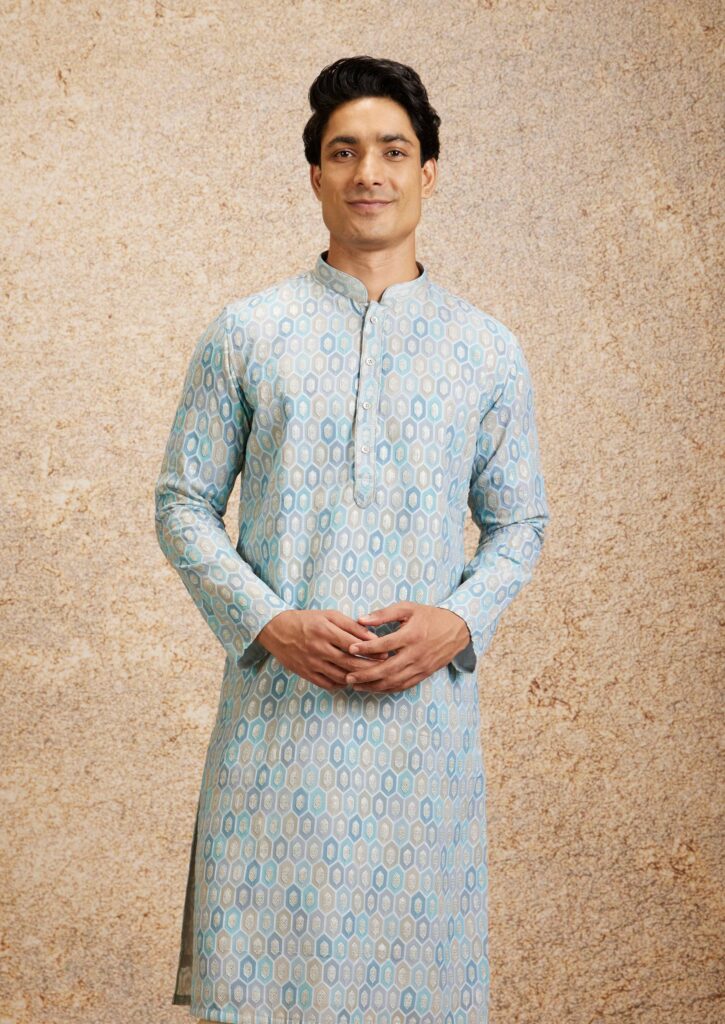 For Him- Make a striking statement at the next wedding fiesta you attend in this dynamic geometric patterned blue kurta and off-white pyjama set. Tinted mosaic patterns glaze the surface of the georgette kurta rendering a gradient effect. A buttoned half placket and mandarin collar shape the neckline and yield a structured look. Accessorise the outfit with a pair of off-white jutis and a silver bracelet; layer it with a half jacket to match the pyjama to create a refined impression.
