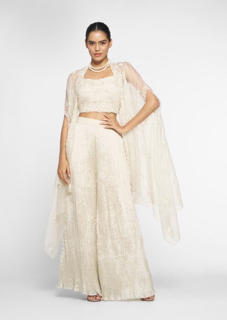 For Her- Drape yourself in elegance with this stunning cream Indo-Western ensemble from the Twamev Collection. Crafted from luxurious Chinon fabric, this outfit exudes sophistication with intricate hand embroidery, Cutdana work, sequin detailing, and delicate stone embellishments. The set includes a stylish top, flowy palazzo, and a statement jacket, making it a perfect choice for wedding festivities, receptions, and special occasions.
