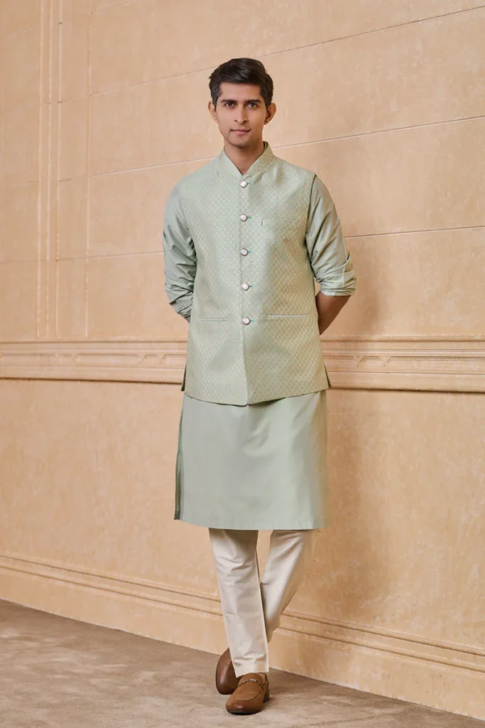 For Him- Embrace elegance with the Green Classic Jacquard Bundi, ideal for morning or daytime festivities. This Nehru Jacket is perfect for friends and family who want a refined yet understated look for pre-wedding events. The jacquard texture adds a subtle sophistication, and the classic green shade pairs beautifully with a simple kurta. This versatile piece embodies traditional style with a touch of modernity, making it a perfect choice for various celebratory occasions. Lightweight and comfortable, it allows you to celebrate with ease and style, making it a timeless addition to your festive wardrobe.