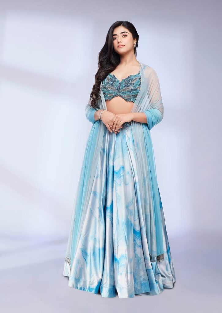 For Her- This teal blue skirt top ensemble features a V-neckline blouse adorned with a leaf pattern and intricate sequin work, adding a touch of sparkle. The skirt showcases a beautiful marble print, creating a unique and eye-catching design. The set is completed with a coordinating net dupatta, enhancing its elegance. Pair this outfit with silver jewelry and strappy heels. A sleek ponytail or loose curls will add a polished finish to this chic and contemporary look.