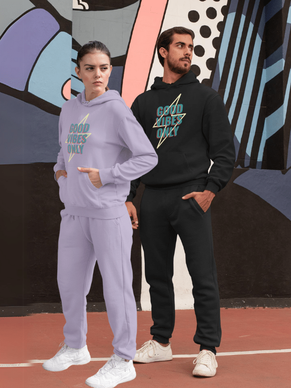 Embrace the ultimate couple goals with the Good Vibes Only Couple Coord Set from WV Stor. Designed for those who love to match, this set features cozy hoodies and joggers adorned with a vibrant “Good Vibes Only” graphic. Available in chic lavender and classic black, these sets are crafted from premium, soft fabric ensuring all-day comfort and style. Perfect for casual outings, gym sessions, or simply lounging at home, this coord set is a must-have for couples who live life with positive energy.