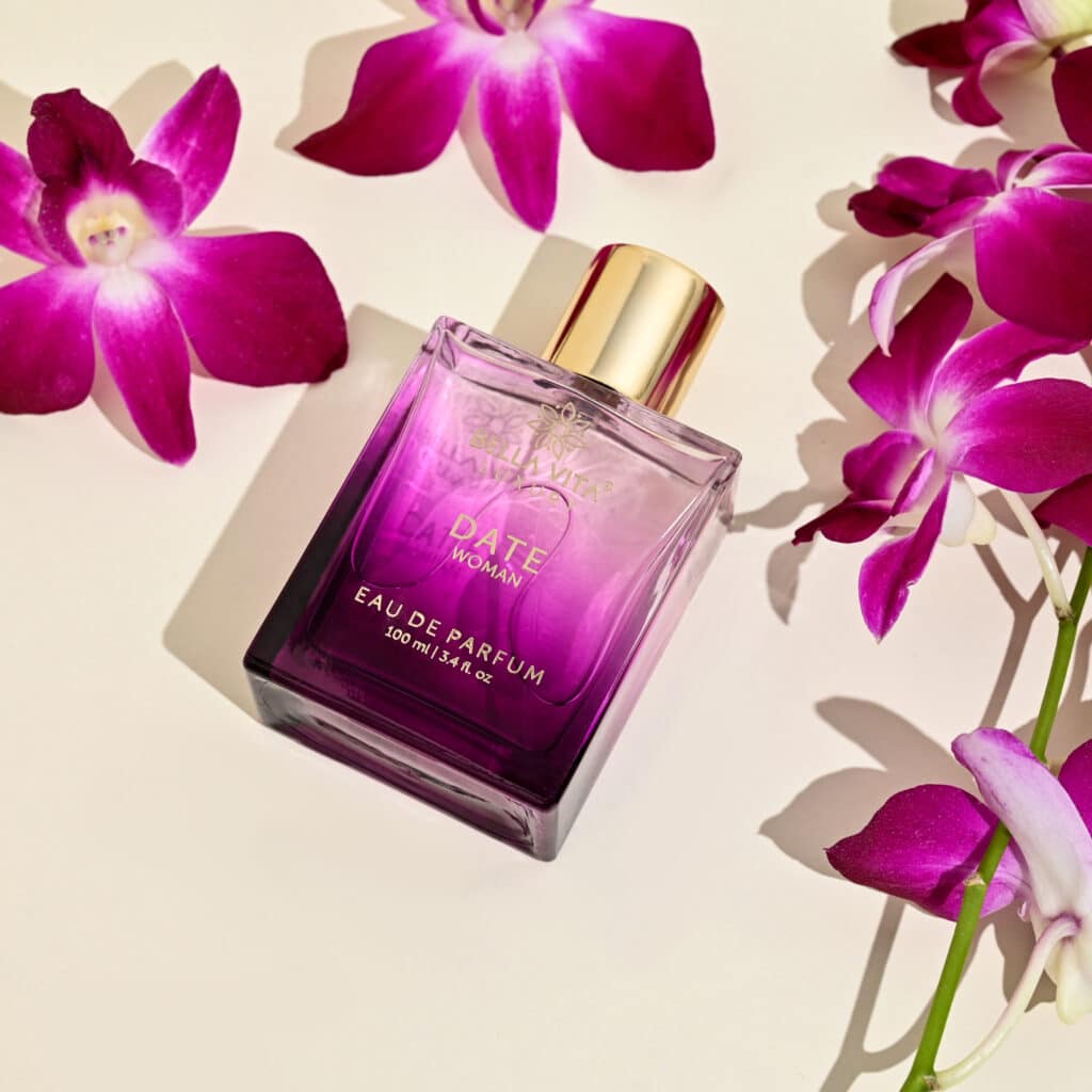 DATE Woman by Bella Vita Luxury is a celebration of love and romance. The perfume has top notes of Pink Pepper and Red Fruits. At its heart, lies the trio of Jasmine, Orange Blossom and Violet, perfect for a romantic date.