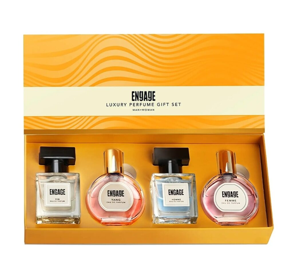 This luxury gift set includes Engage Yin Engage Yang Engage Homme and Engage Femme offering an irresistible mix of fragrances for both men and women. Perfect for daily wear casual outings brunches and gifting.