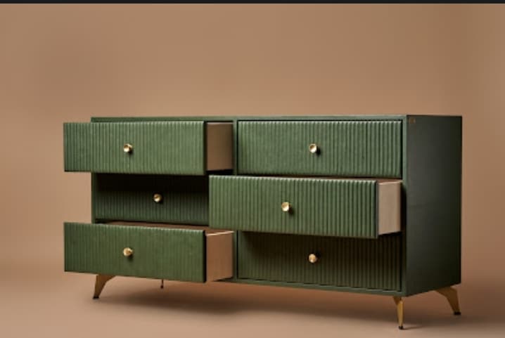 Adorn your home with the captivating allure of our artisanal and handmade Linear Chest of Drawers from HOUSE OF GLENFIDDICH range by THREE SIXTY. With quilted front panels, brass knobs, brushed antique gold hardwares, and a plush beige suede lining, it exudes an air of elegance that will enhance any space. This chest features six spacious drawers with Hettich channels. Inside, a plain suede fabric lining adds a touch of luxury to your cherished belongings.