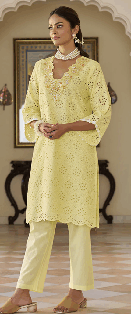 The Multi Embroidered Neck Schiffli Co-Ord Set is a stylish ensemble made from pure cotton fabric, offering both comfort and breathability. The set features intricate multi embroidery around the neckline, showcasing delicate, colorful threadwork that enhances the overall design. The Schiffli embroidered fabric adds a touch of tradition with its fine, lace-like detailing. Perfect for festive occasions or casual outings, this co-ord set is a timeless addition to your wardrobe.