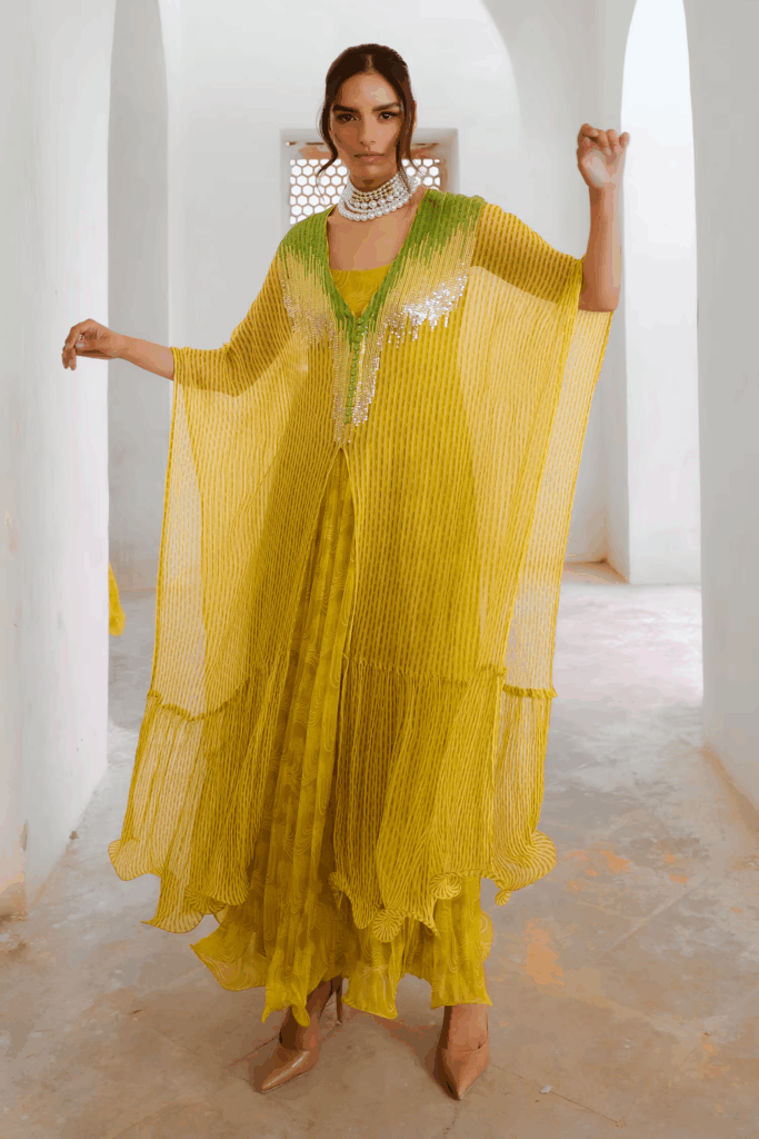 Featuring a deep V-neckline and a relaxed, fluid silhouette, this kaftan is designed to drape effortlessly—making it the perfect statement piece for haldi ceremonies, destination soirees, or sundowner cocktails. The play of transparency, texture, and artisanal embroidery creates a look that’s both bohemian and couture-inspired.