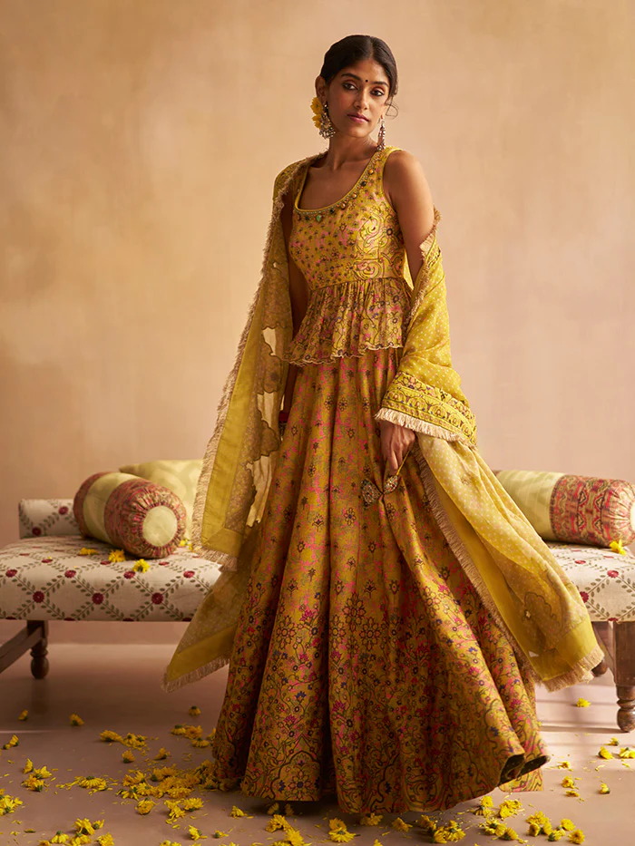 Draped in regal radiance, the Nida lehenga set features a sleeveless peplum choli paired with a kalidar lehenga and printed dupatta. Cord embroidery, adorned with stones and beads highlights the lehenga waistband and choli neckline while the dupatta is accentuated with a zari fringe.