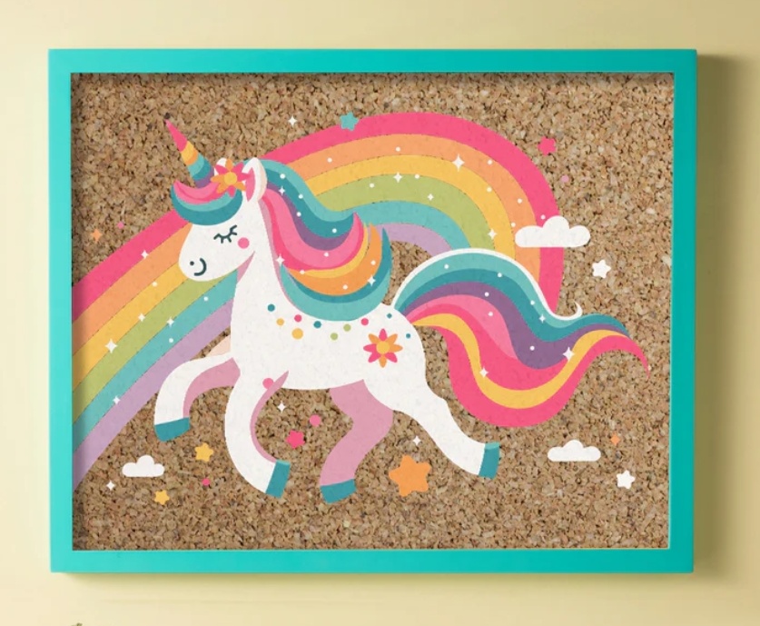 Add a dash of whimsy to their world with this colorful corkboard. Perfect for pinning art, photos, or daily goals—this unicorn-inspired decor is equal parts adorable and functional.