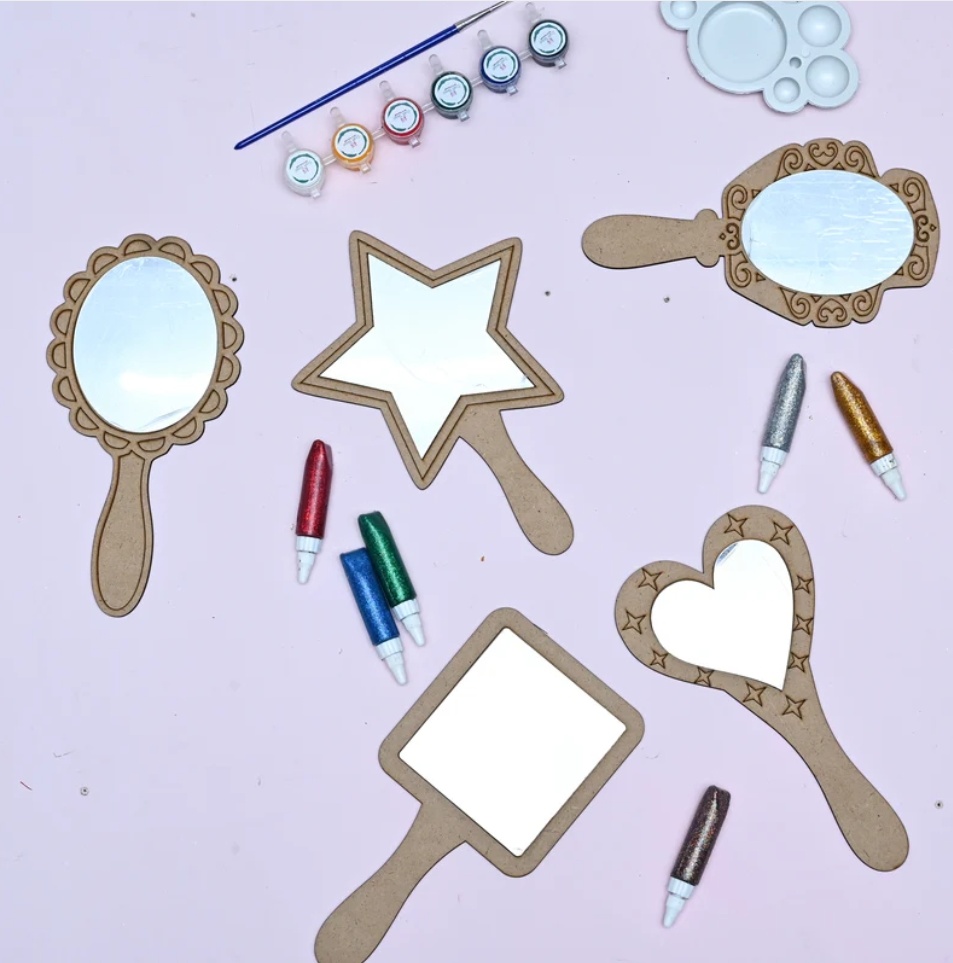 Let their imagination run wild! This DIY mirror kit includes five fun shapes, paints, glitter, and more. A creative experience that makes them feel one-of-a-kind—because they are.