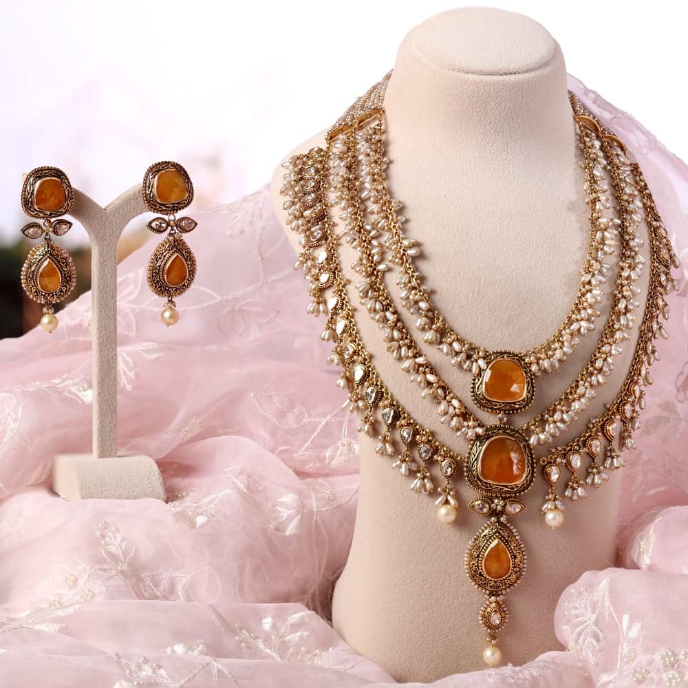 Forget traditional yellow gold—this season, it’s all about champagne diamonds, burnt gold, and vintage rose gold accents. Mocha Mousse pairs beautifully with kundan-polki, unpolished rubies, and chocolate-hued gemstones.